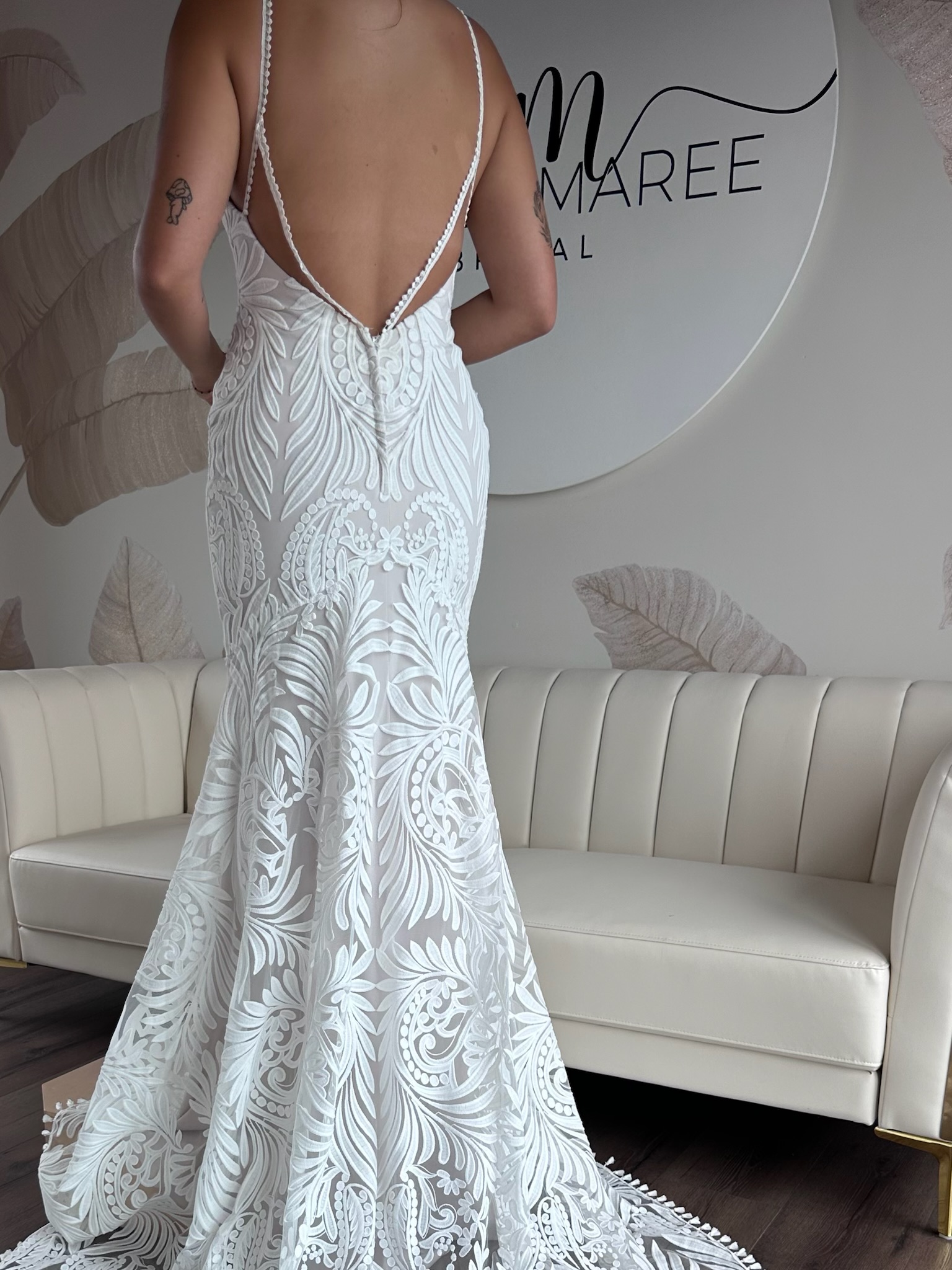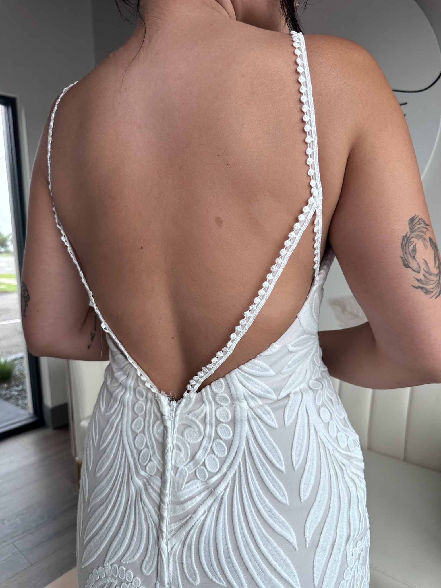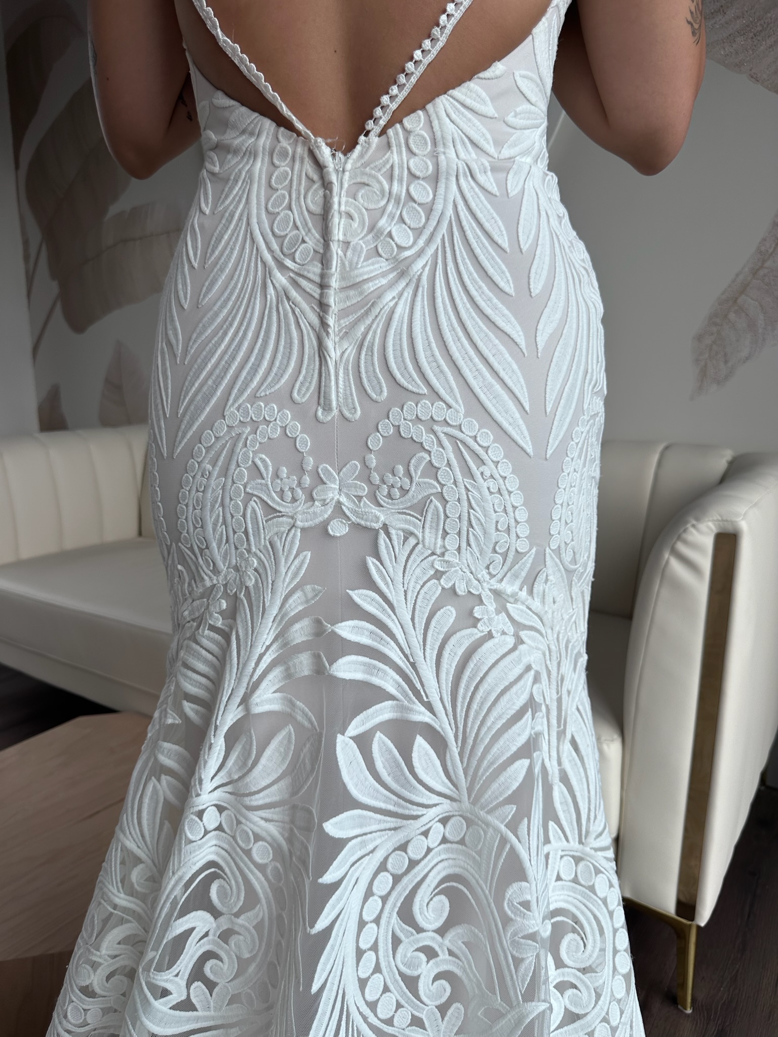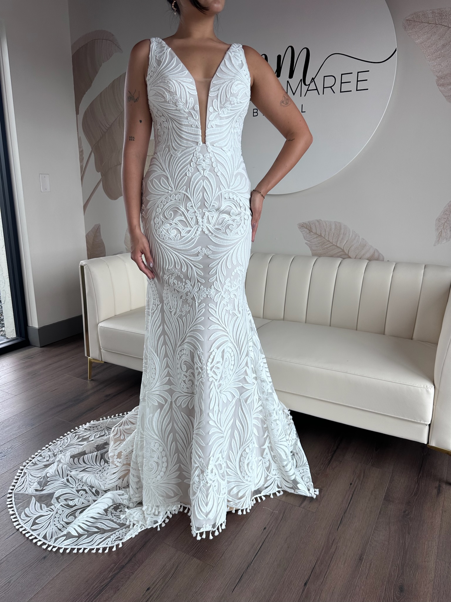 This sample gown is sold as-is and deeply discounted, which means all sales are final, no returns, refunds, or exchanges. Be sure to triple check the provided sizing information and details carefully before proceeding.