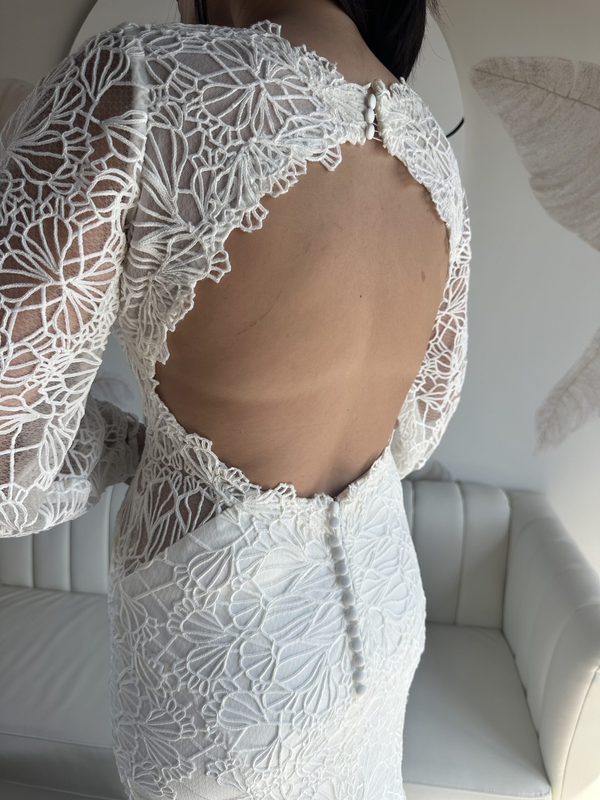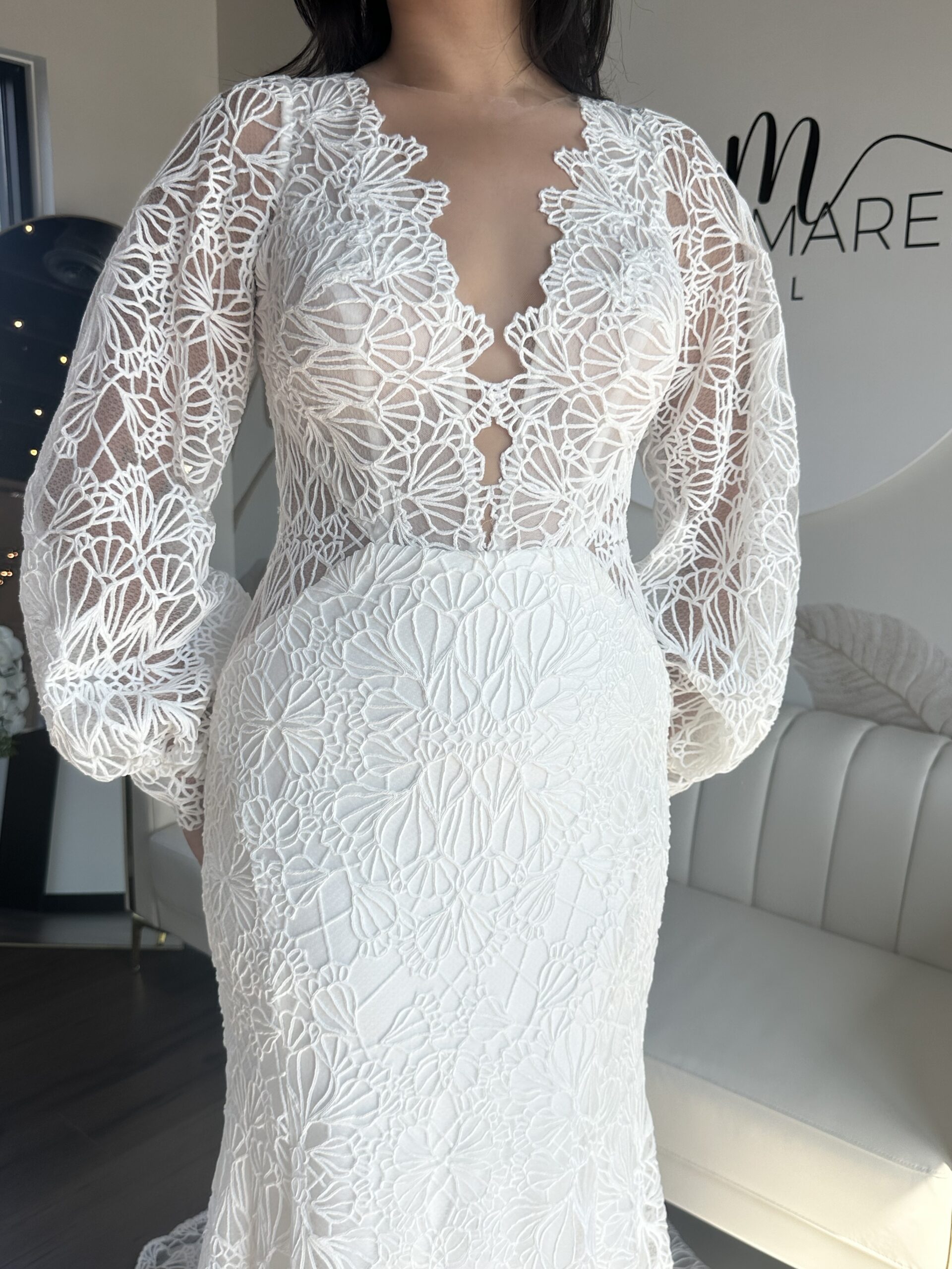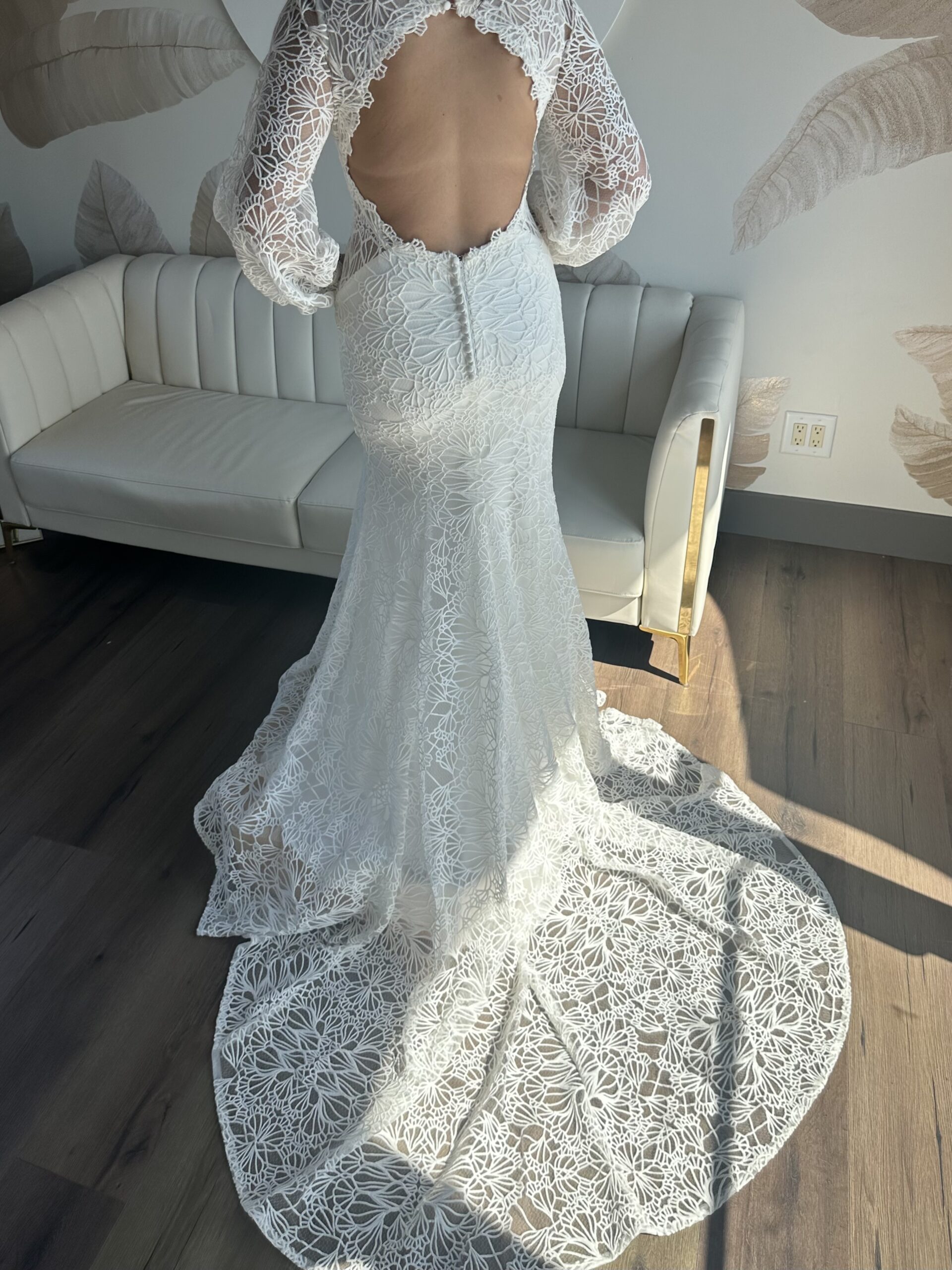 This sample gown is sold as-is and deeply discounted, which means all sales are final, no returns, refunds, or exchanges. Be sure to triple check the provided sizing information and details carefully before proceeding.
