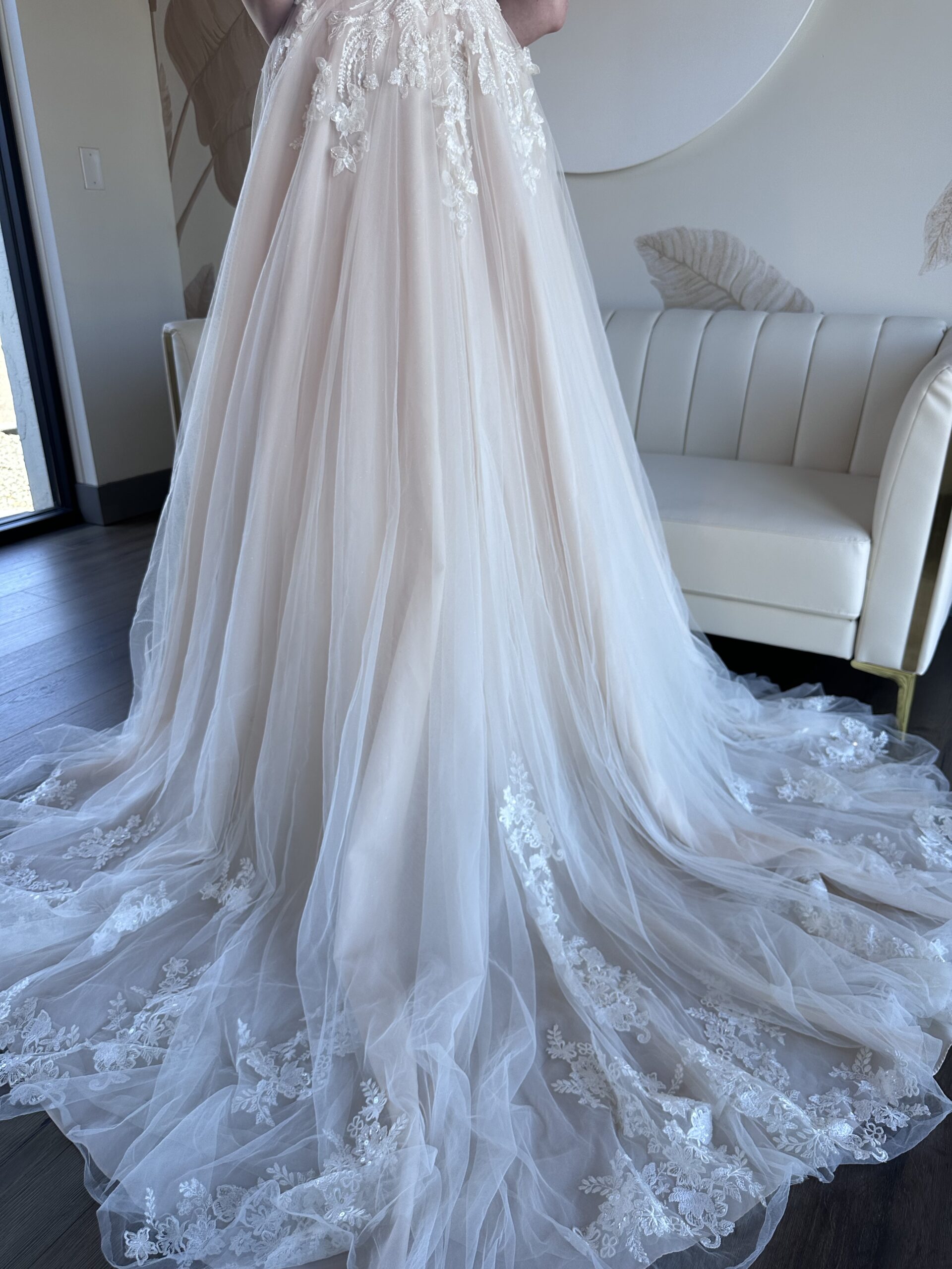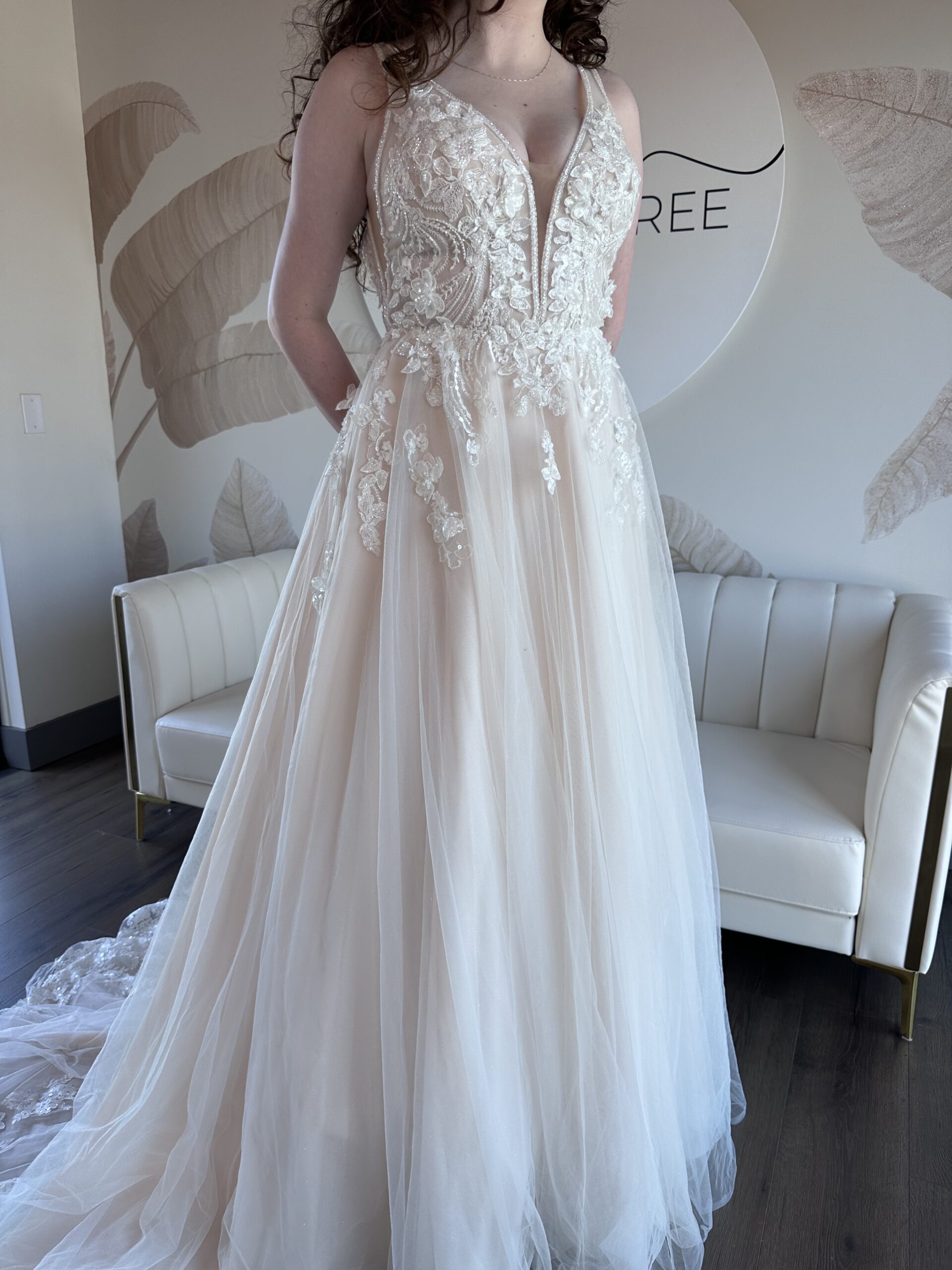 This sample gown is sold as-is and deeply discounted,  which means all sales are final, no returns, refunds, or exchanges. Be sure to triple check the provided sizing information and details carefully before proceeding.