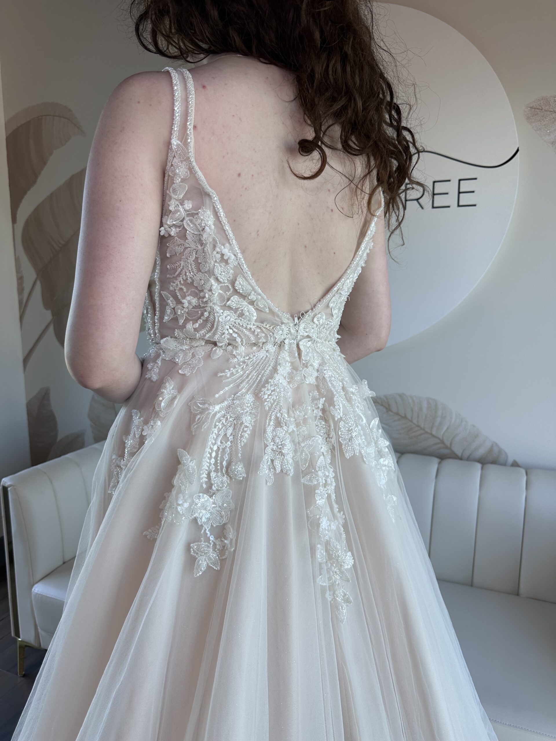 Tulle A-line, with plunge neckline, beaded floral details and thick straps