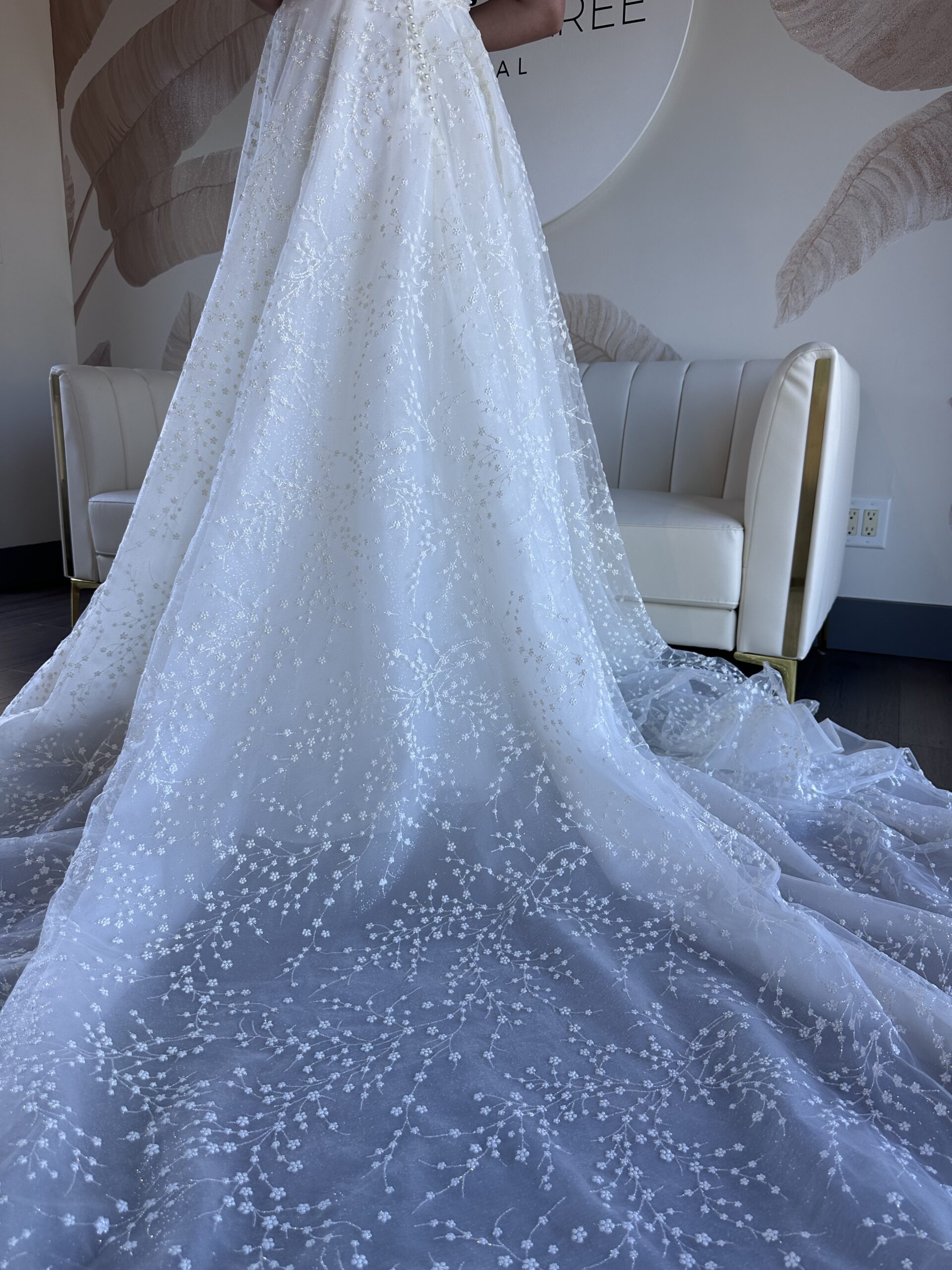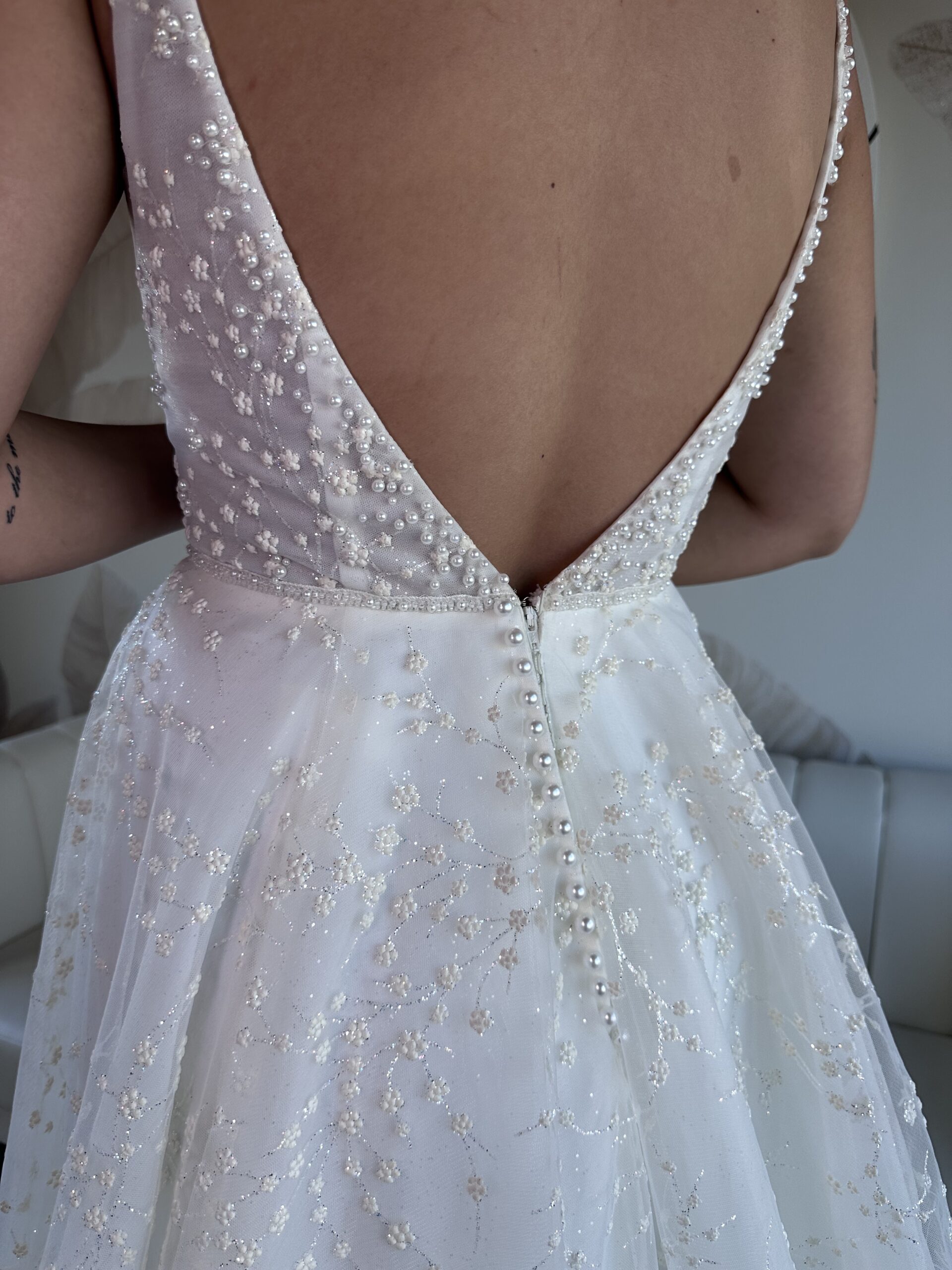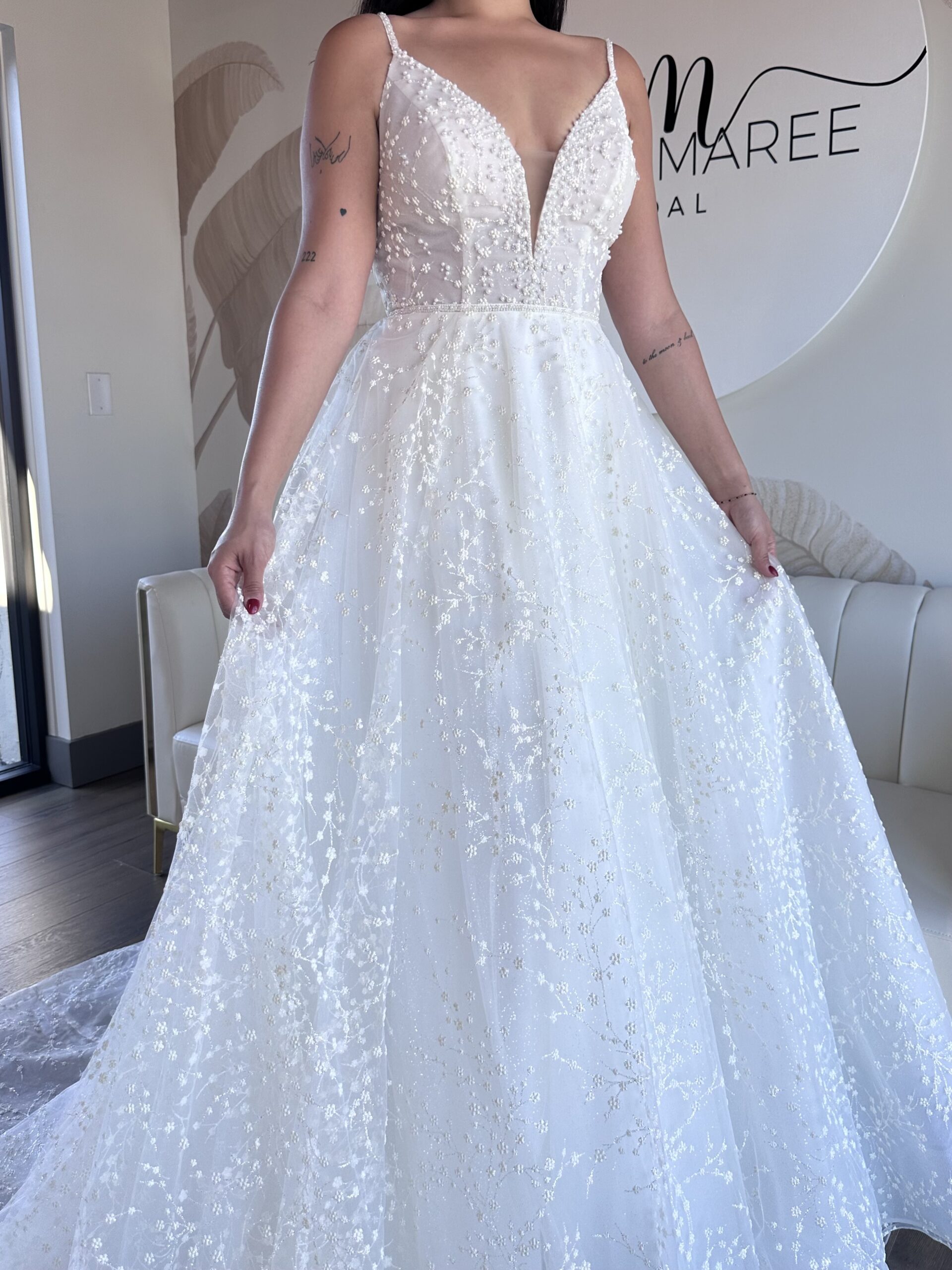 This sample gown is sold as-is and deeply discounted,  which means all sales are final, no returns, refunds, or exchanges. Be sure to triple check the provided sizing information and details carefully before proceeding.
