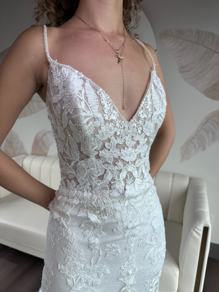 This sample gown is sold as-is and deeply discounted,  which means all sales are final, no returns, refunds, or exchanges. Be sure to triple check the provided sizing information and details carefully before proceeding.