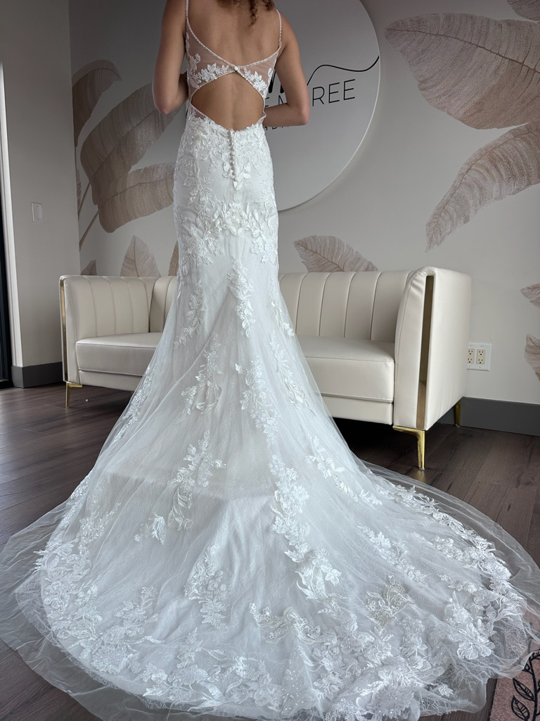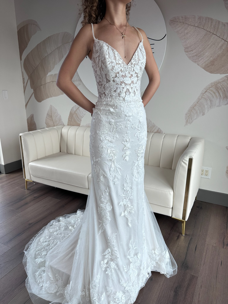 This sample gown is sold as-is and deeply discounted, which means all sales are final, no returns, refunds, or exchanges. Be sure to triple check the provided sizing information and details carefully before proceeding.