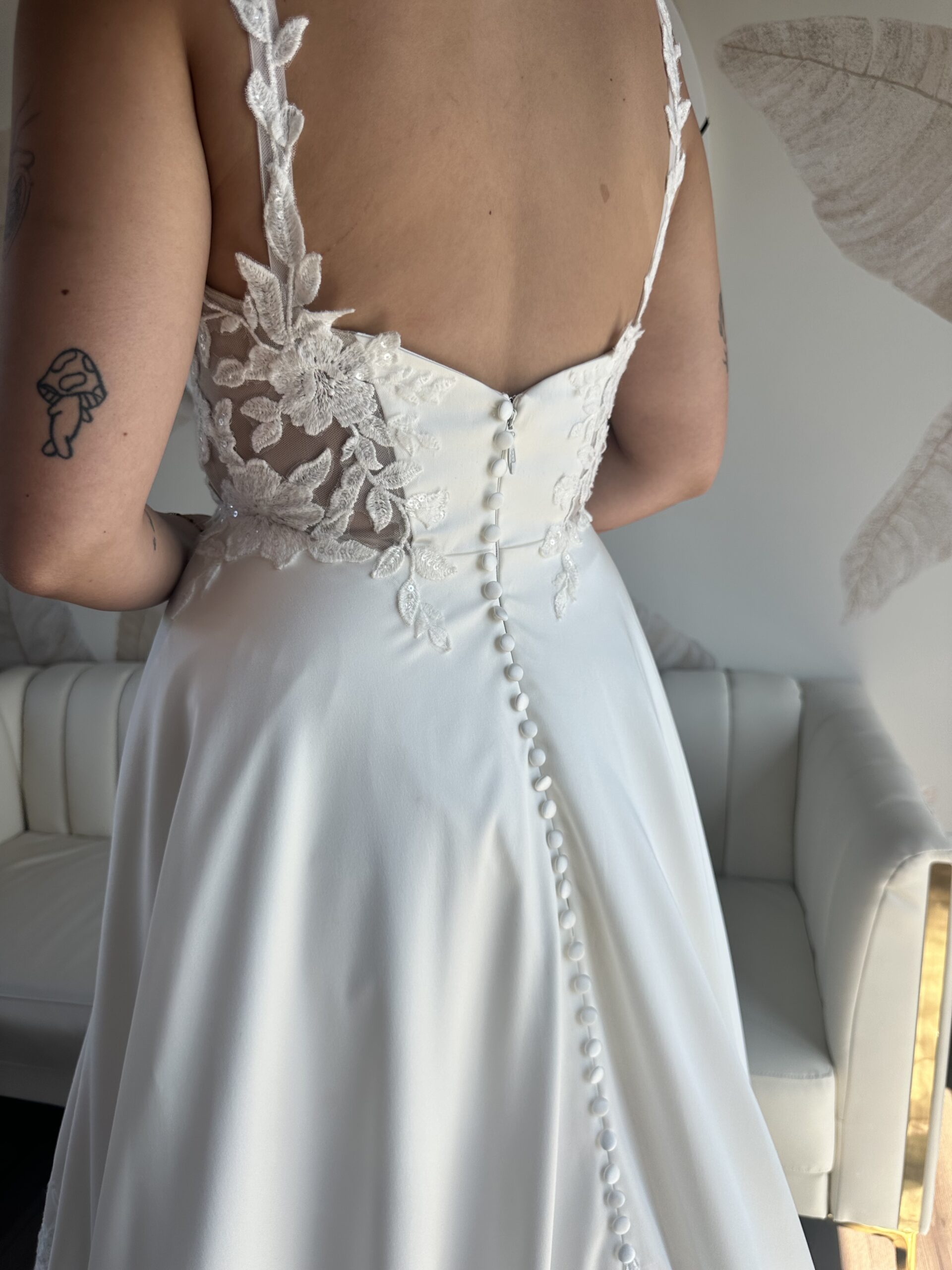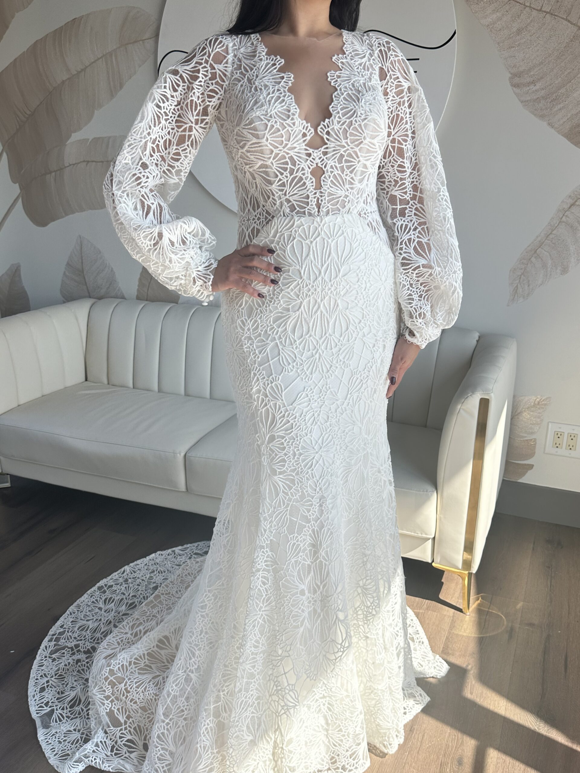 This sample gown is sold as-is and deeply discounted, which means all sales are final, no returns, refunds, or exchanges. Be sure to triple check the provided sizing information and details carefully before proceeding.