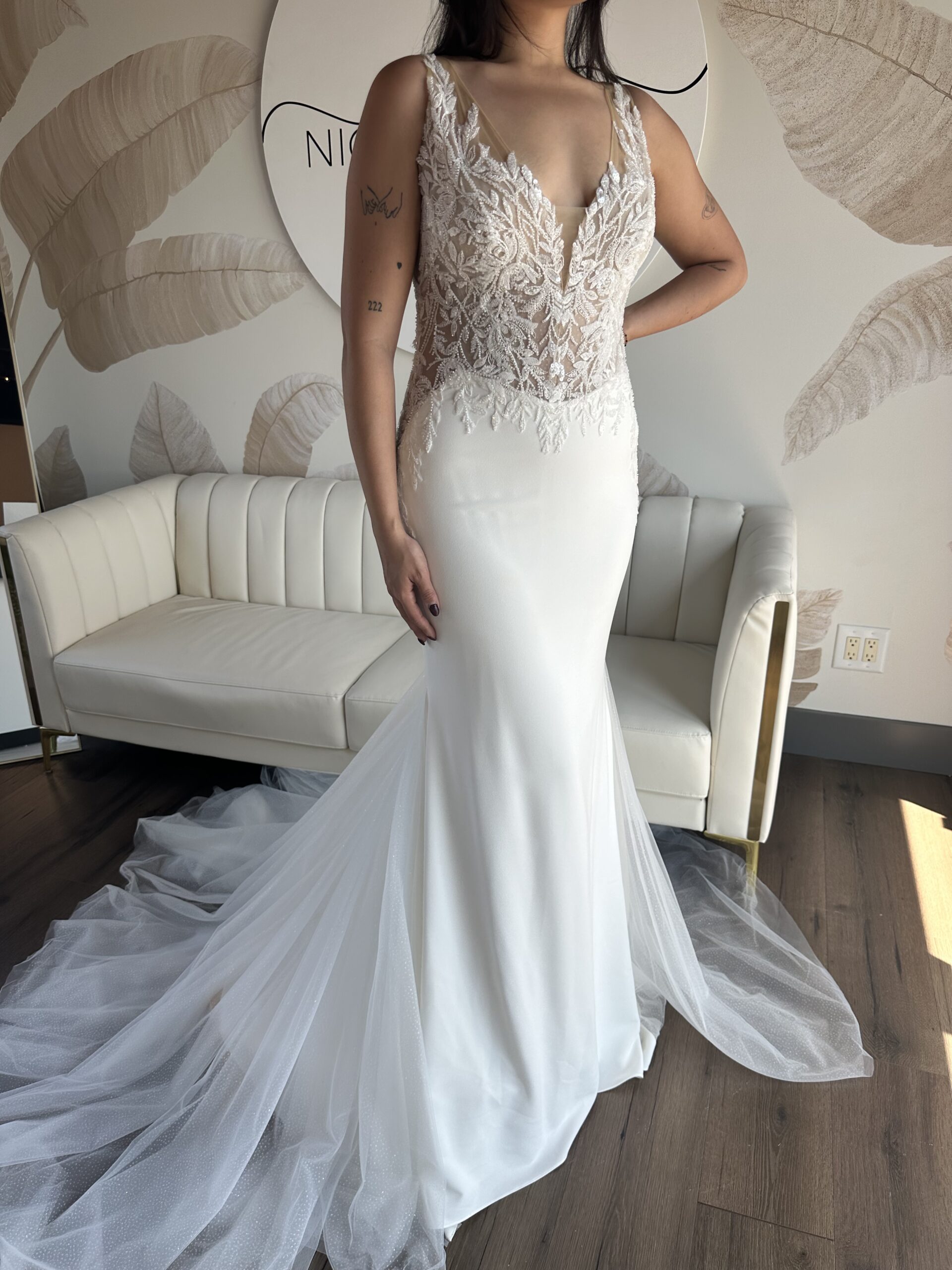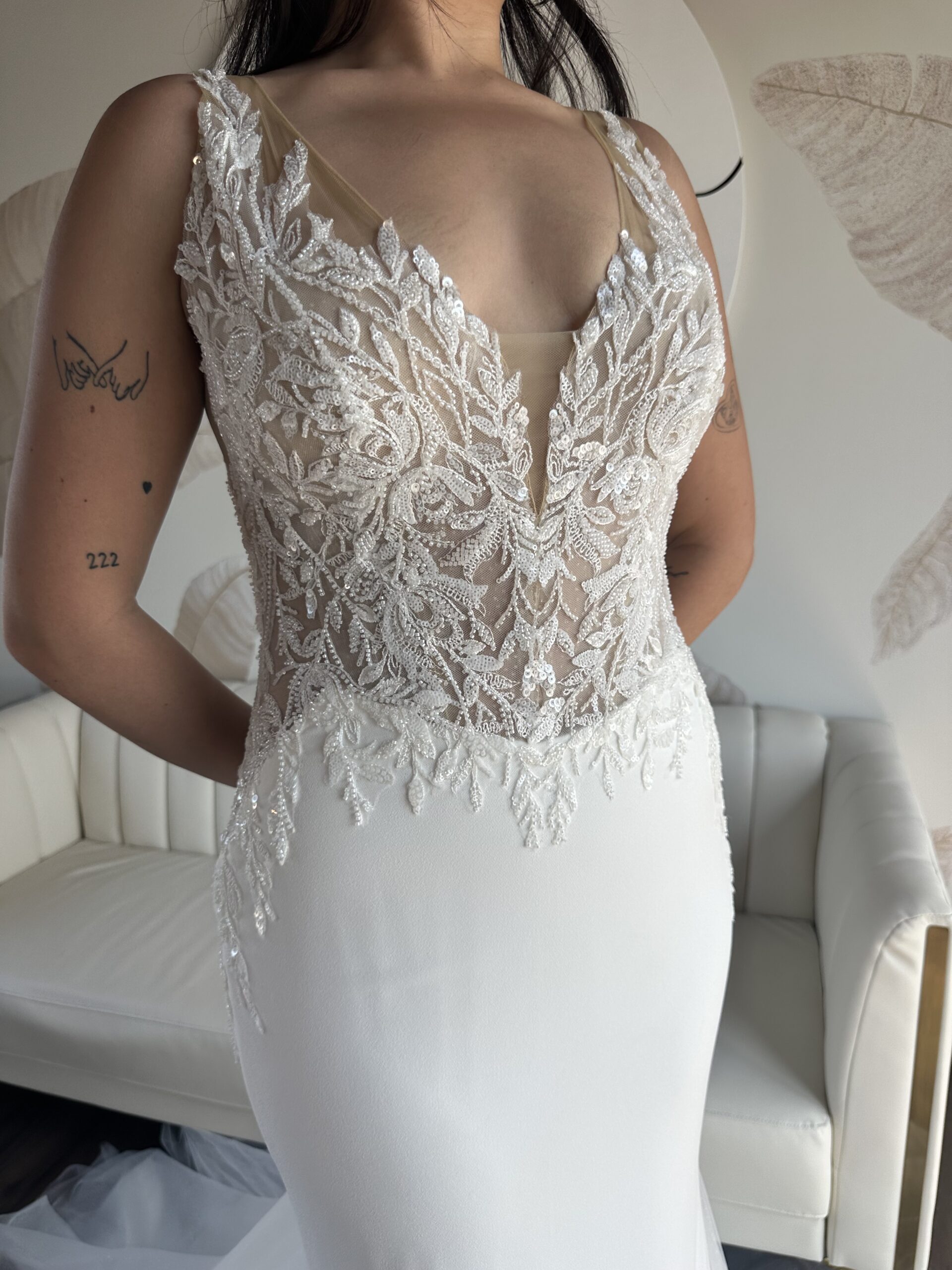 This sample gown is sold as-is and deeply discounted, which means all sales are final, no returns, refunds, or exchanges. Be sure to triple check the provided sizing information and details carefully before proceeding.